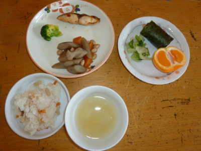 おやつ チンゲン菜ごま和え のり巻き みかん 味噌汁 玄米スープ