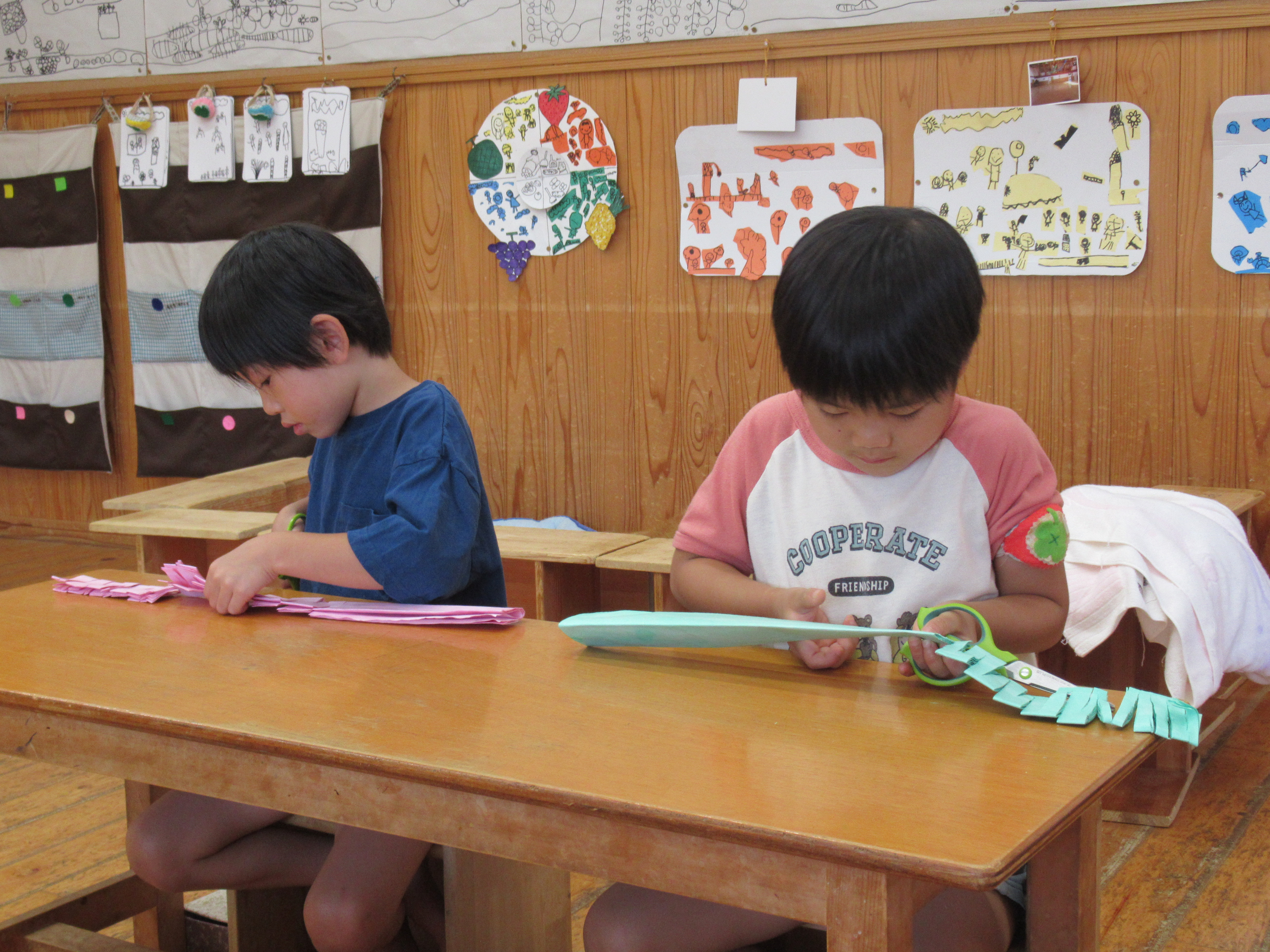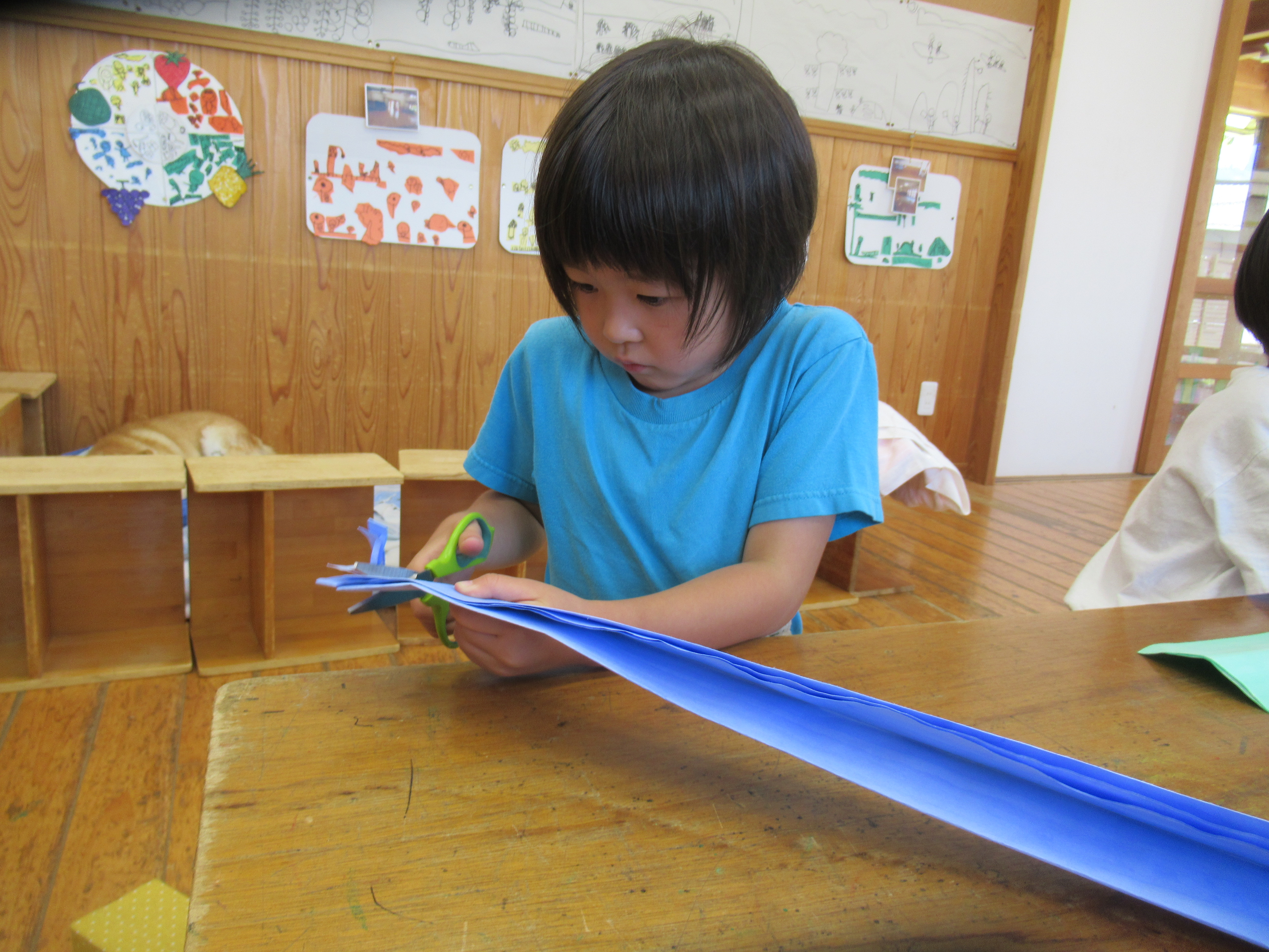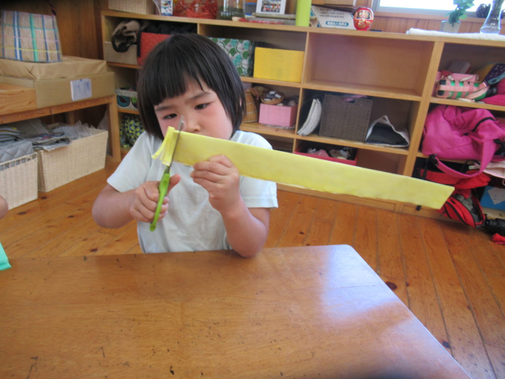 2024年12月11日 まり袋 なわとびやこまを入れるまり袋を作りました。 まずは‘縫い染め”に挑戦。 10月生まれのお母さんの力も借りて、 綺麗な色に染まりました。 お母さんたちが縫ってくれた縫い染めの布を 袋にするために1針1針丁寧に縫っていきます。 世界に1つだけの素敵なまり袋が出来上がりました。