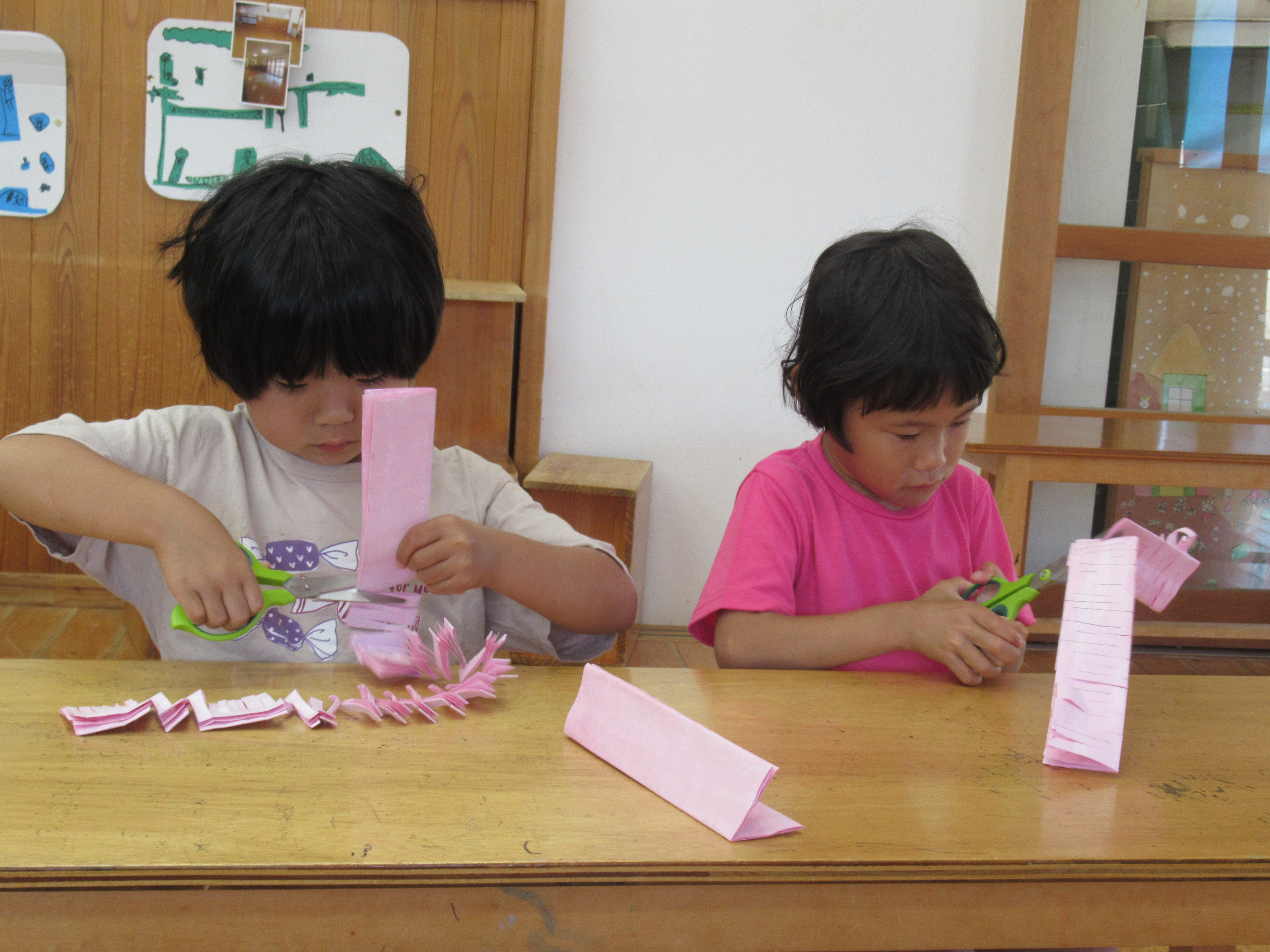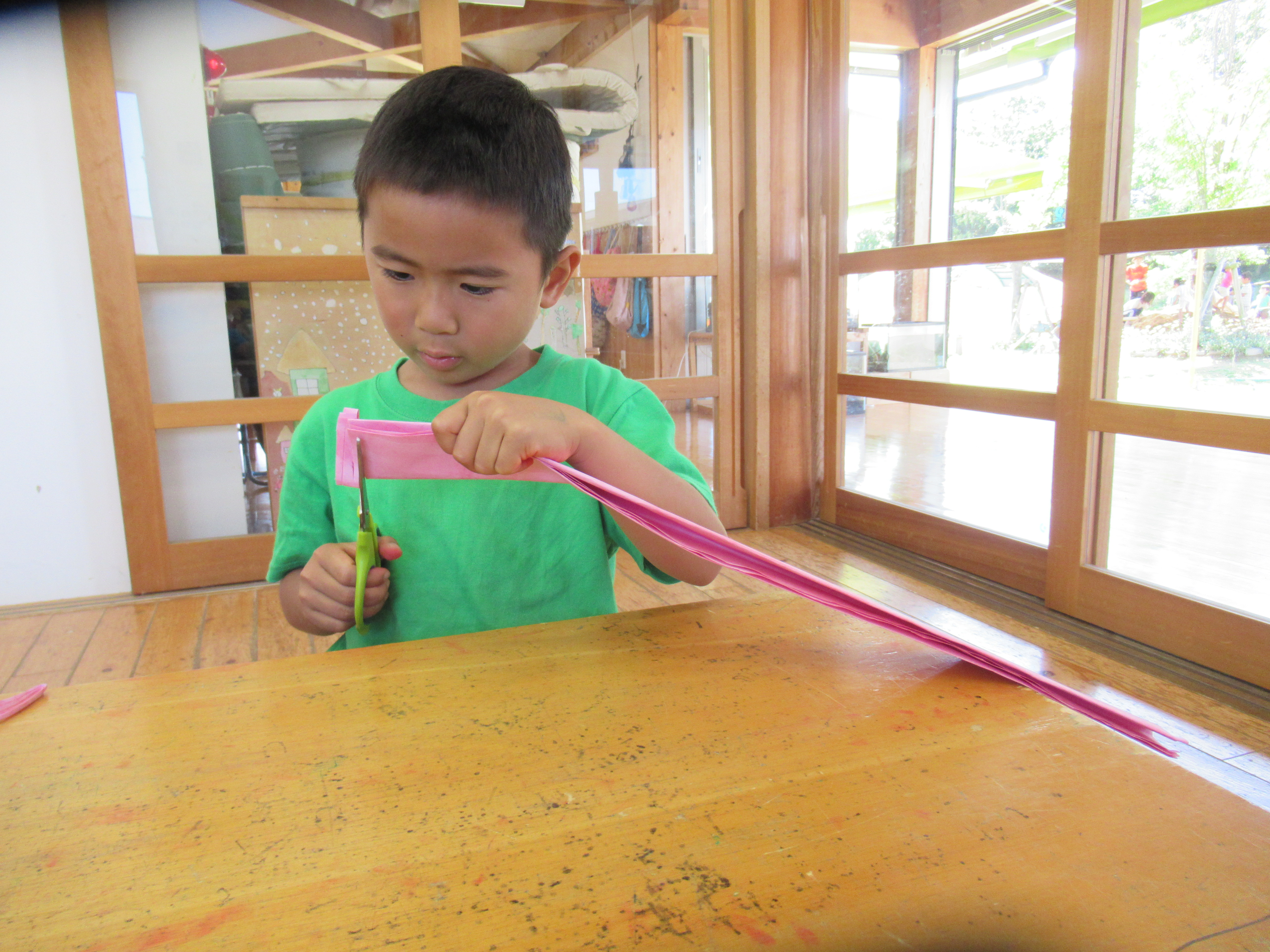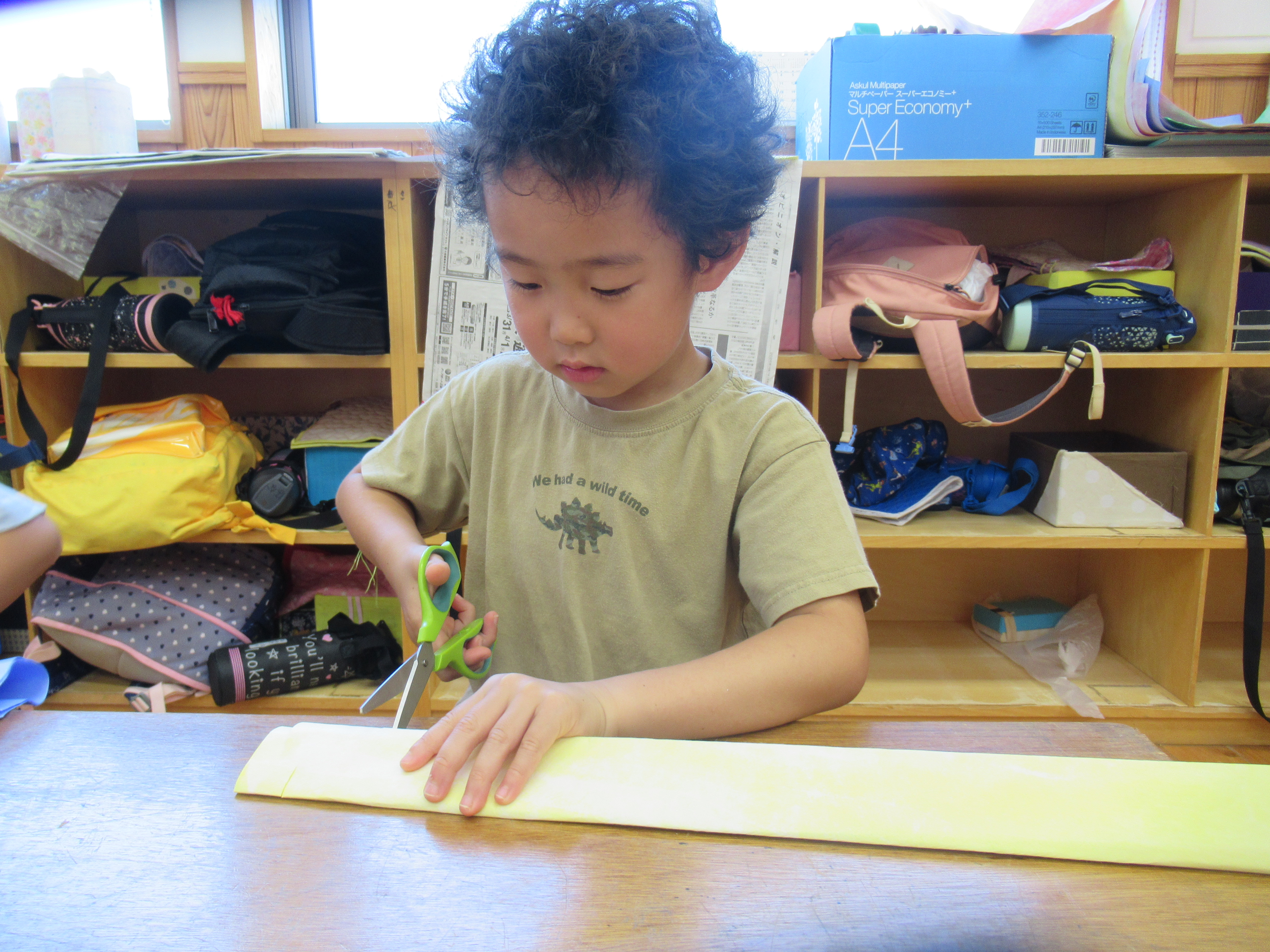 2024年12月11日 まり袋 なわとびやこまを入れるまり袋を作りました。 まずは‘縫い染め”に挑戦。 10月生まれのお母さんの力も借りて、 綺麗な色に染まりました。 お母さんたちが縫ってくれた縫い染めの布を 袋にするために1針1針丁寧に縫っていきます。 世界に1つだけの素敵なまり袋が出来上がりました。