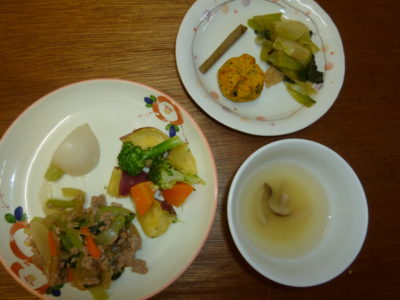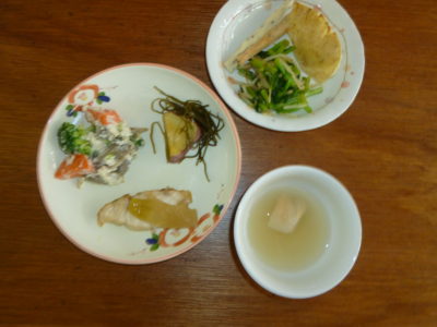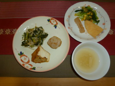 おやつ チンゲン菜煮浸し 茶巾南瓜 ごぼう煮 味噌汁 玄米スープ