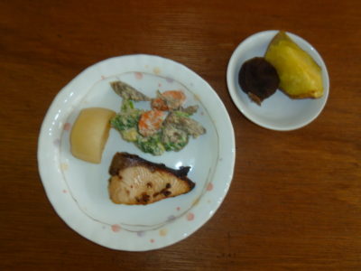 おやつ ほうれん草おかか和え 焼いも りんご