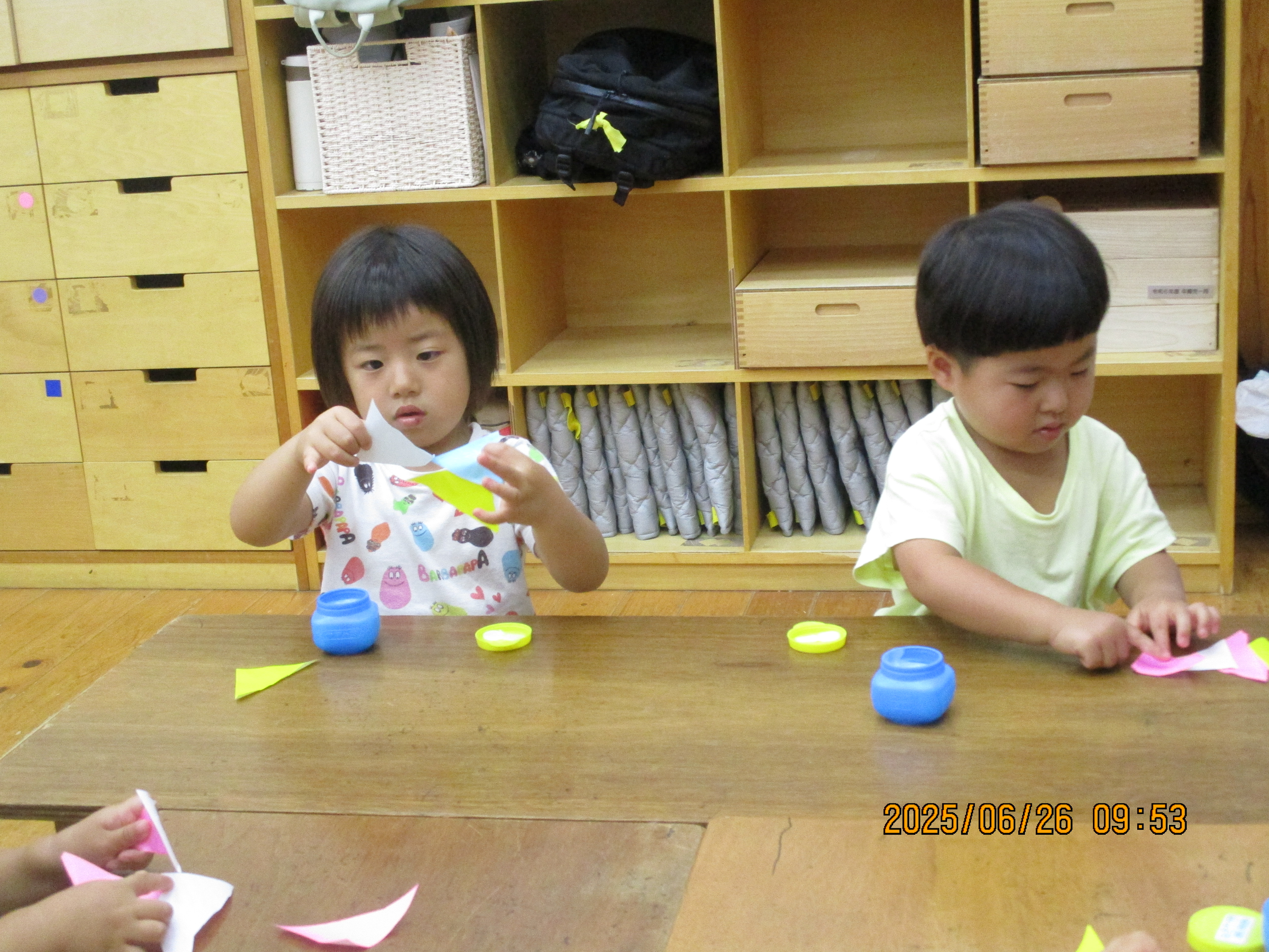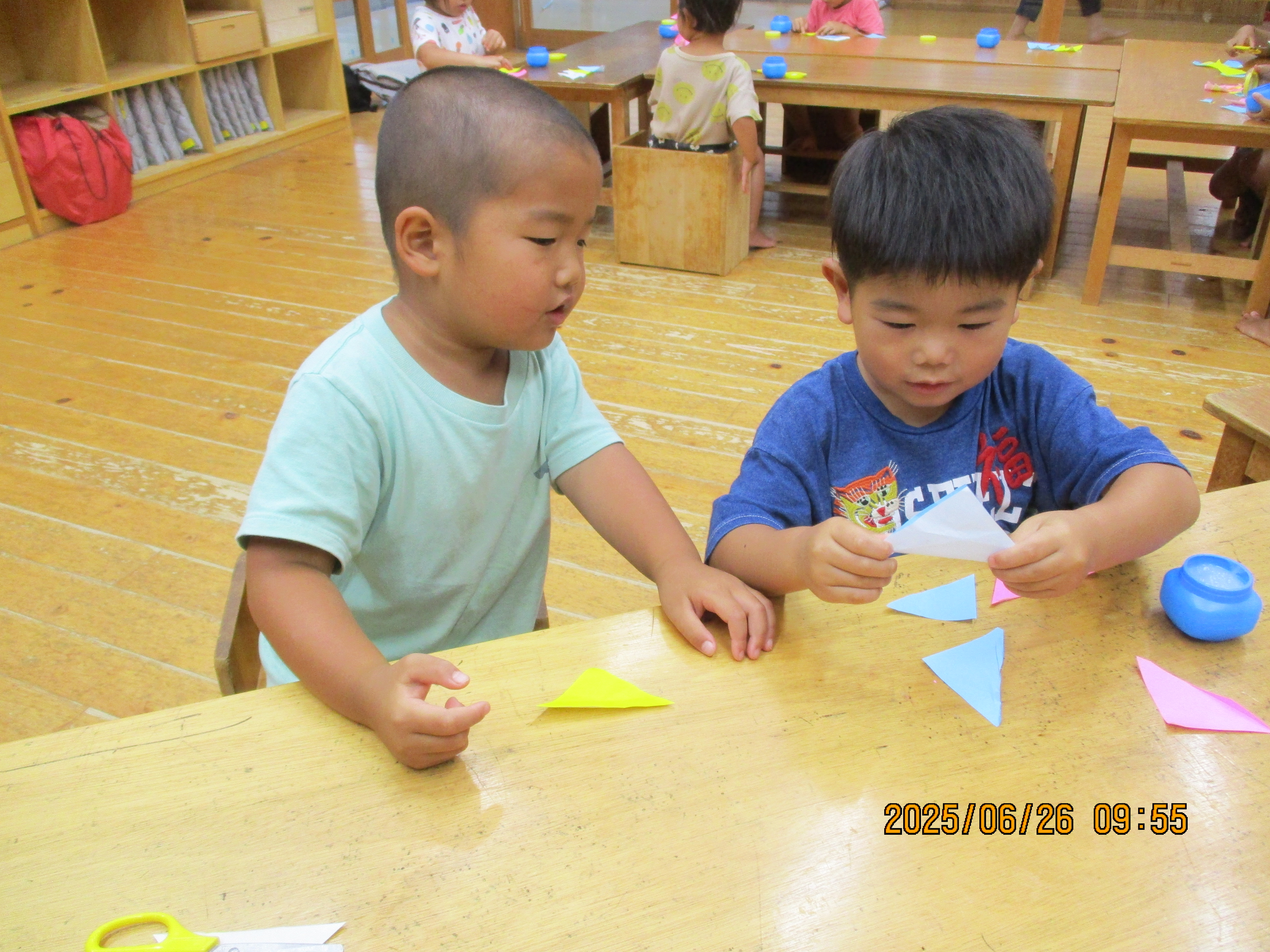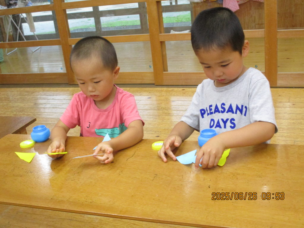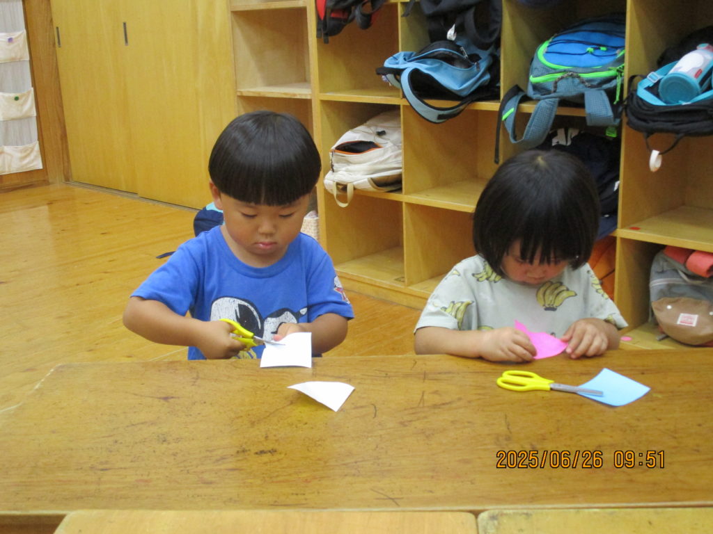 5才児は、3才児が折ったものを切って、自分のは折らずにそのままハサミで切ります。